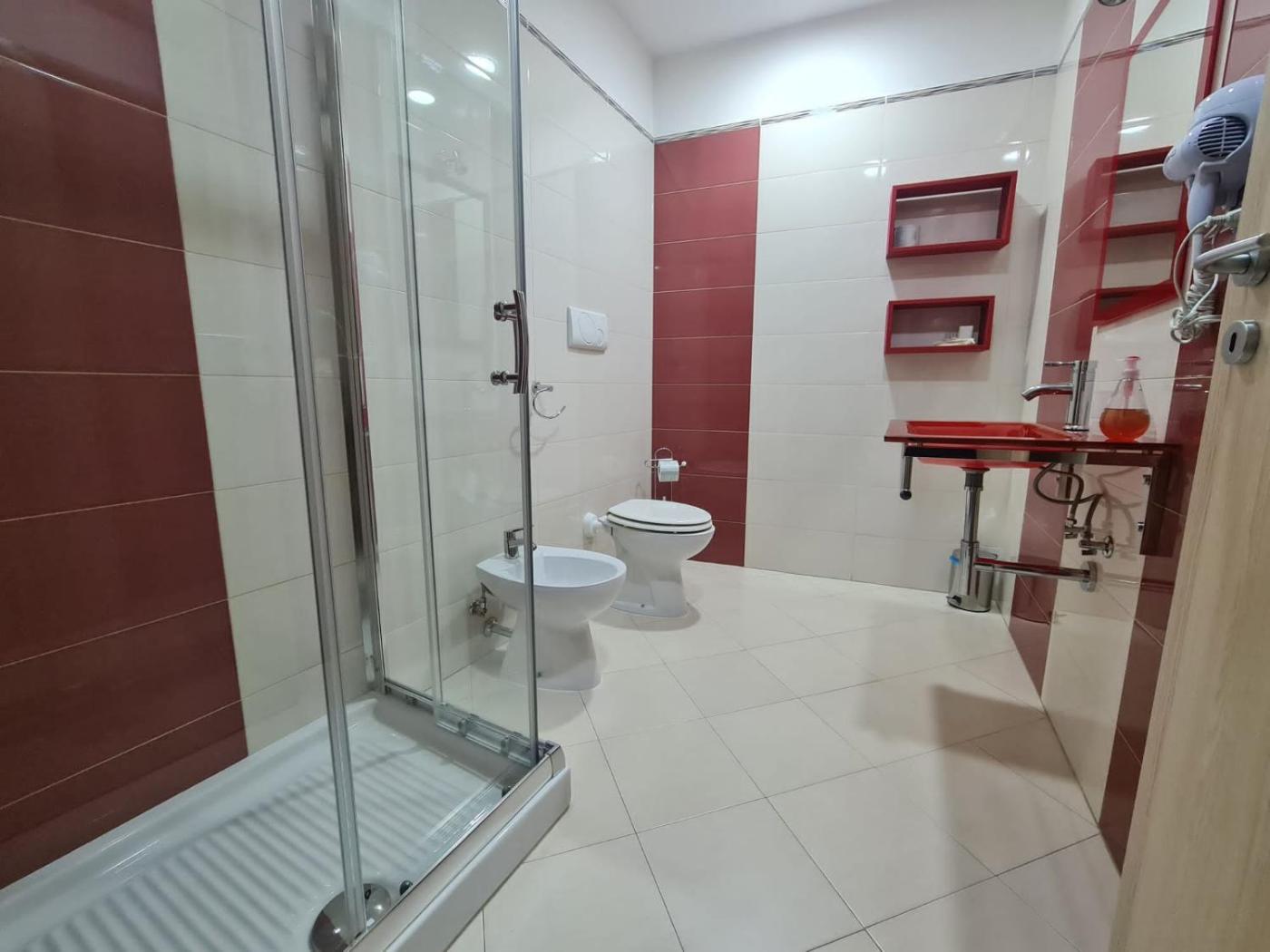 Ogni alloggio presenta un bagno privato con bidet, l’aria condizionata, una TV a schermo piatto e un frigorifero.